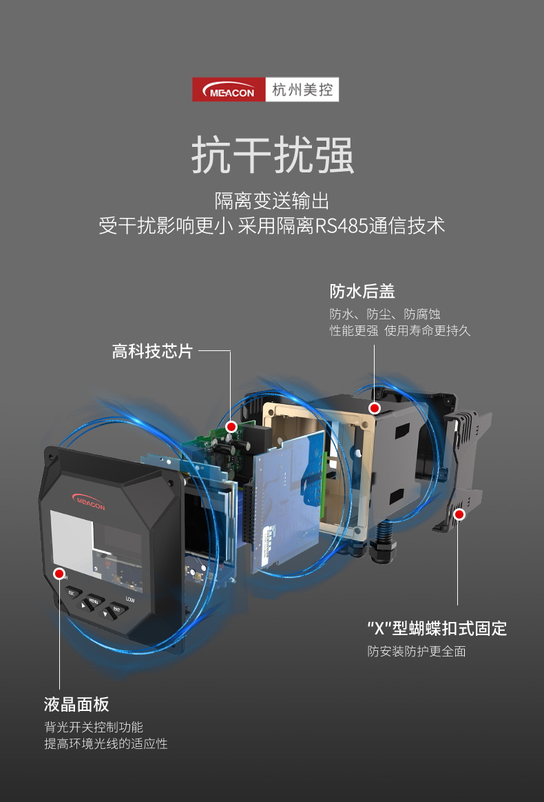 显示:2.8英寸单色液晶显示屏,分辨率128*64 外形尺寸:100mm×100mm×150mm 开孔尺寸:92.5mm×92.5mm 监测参数:pH、ORP、电导率、溶解氧、浊度、污泥浓度 显示范围:pH:(0~14)pH;ORP:(-2000~2000)mV;溶解氧:(0~40)mg/L;饱和度:(0~200)%;电导率:(0~600)mS/cm;浊度:(0~4000)NTU;污泥浓度:(0~120000)mg/L 电流输出:隔离式,(4~20)mA可设定对应参数测量范围,带载能力500Ω,输出精度±0.2%FS RS485:输出隔离式,Modbus-RTU通信协议 RS485:常开常闭型,2路,容量AC250V/3A 配电输出:12V/125mA 相对湿度:(10~85)%(无结露) 工作温度:(0~60)℃ 输入电源:AC:(100~240)VAC;DC:24VDC(可选配) 贮存条件:温度:(-15~65)℃;相对湿度:(5~95)%(无结露);海拔高度:<2000m