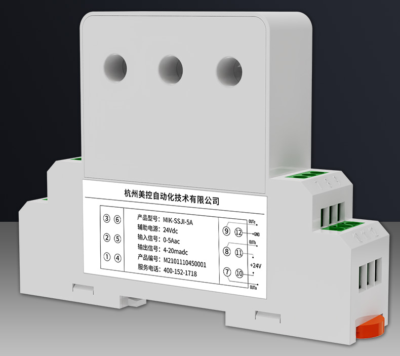 精度等级:0.5级 辅助电源:+12V、+15V、+24V(可选) 输入量程:AC 1~30A(根据客户量程定制) 输入频率:50Hz 输出信号:0-5V、0-10V、0-20mA、4-20mA(可选) 环境温度:-10℃~+60℃ 负载能力:电压输出≥2kΩ、电流输出≤250Ω 静态功耗:≤0.5W 额定功耗:≤1.5W 隔离耐压:DC 2500V 响应时间:≤300ms 温漂系数:≤300PPm/℃ 雷击浪涌:电源端2000V、输入端10000A、输出端500V 外壳材质:ABS阻燃 安装方式:卡在标准35mm DIN导轨上