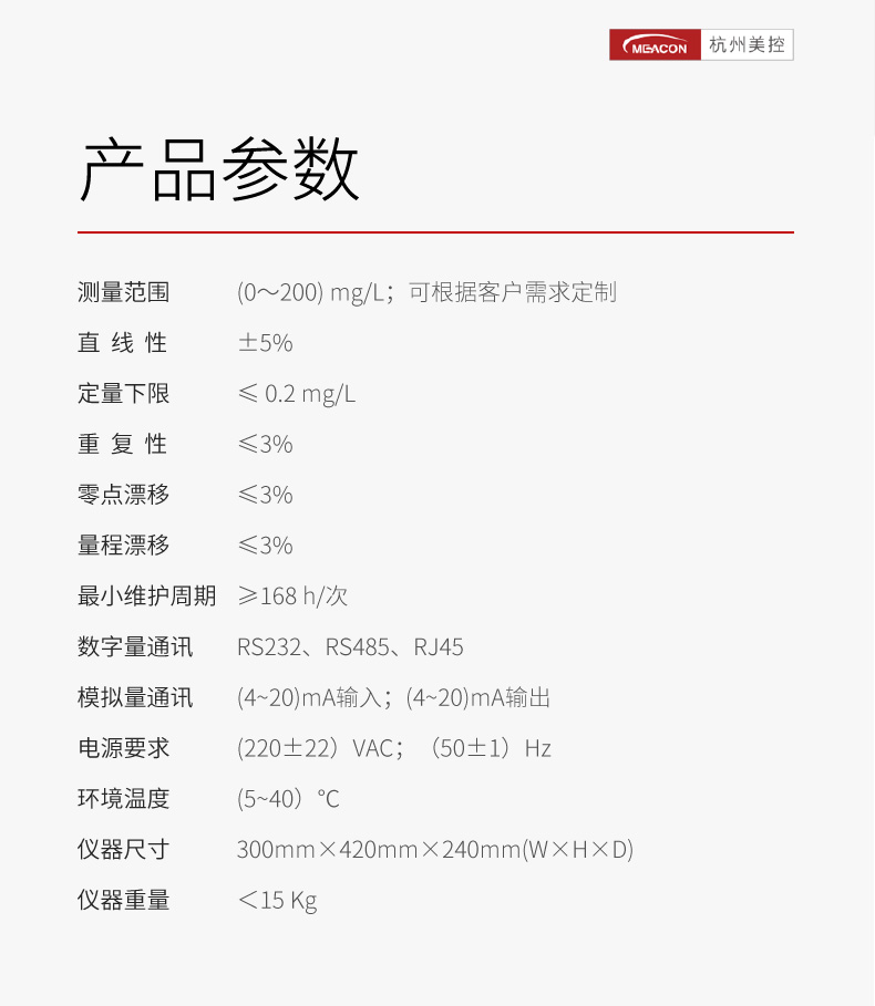 测量范围:(0~200) mg/L;可根据客户需求定制 直线性:±5% 定量下限:≤0.2 mg/L 重复性:≤3% 零点漂移:≤3% 量程漂移:≤3% 最小维护周期:≥168 h/次 数字量通讯:RS232、RS485、RJ45 模拟量通讯:(4~20)mA输入、(4~20)mA输出 电源要求:(220±22)VAC;(50±1)Hz 环境温度:(5~40)℃ 仪器尺寸:300mm×420mm×240mm(W×H×D) 仪器重量:<15 Kg